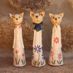 Keramická kočka, 23 cm na výšku. Soška je částečně barvená engobami a zatřená burelem a tělo sošky je bíle glazováno a zdobeno květinami.